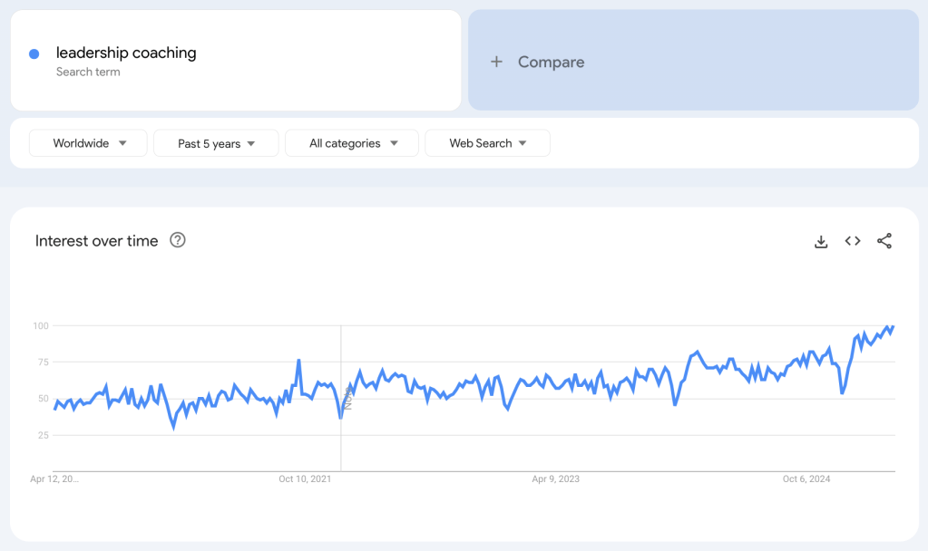 The search volume for “leadership coaching” has doubled in the last 5 years, and coaches need long-tail keywords to stand out (Google Trends)